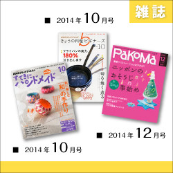 • 雑誌:すてきにハンドメイド、きょうの料理ビギナーズ、PAKOMA 2014年10月-12月掲載